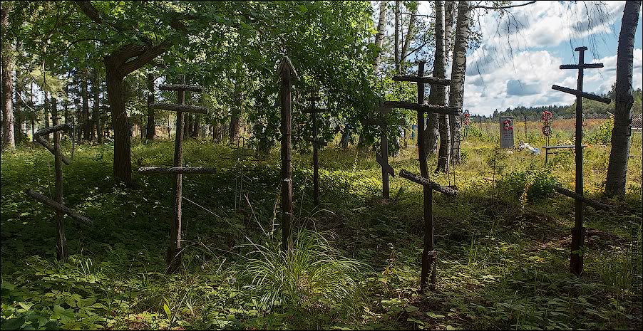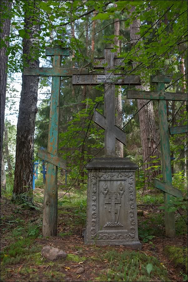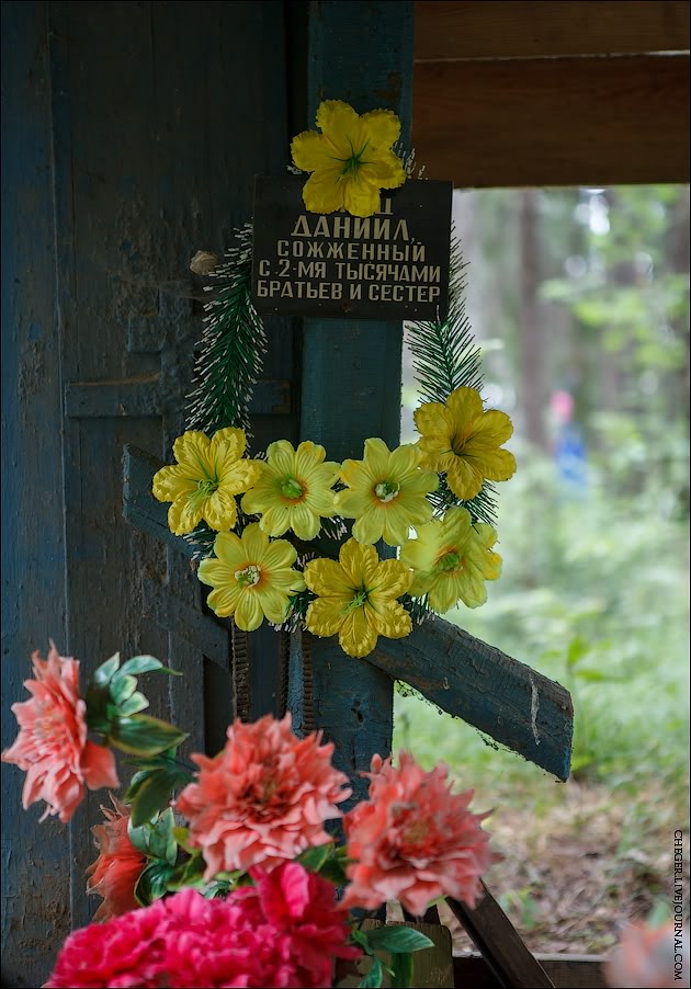 Попрощавшись с лесником, я пошел обратно по лесной дороге, заглянув на старое кладбище. На нем я обнаружил ещё одну особенную могилу, на кресте, установленном там, было написано "Отец Даниил, сожженный с двумя тысячами братьев и сестер".