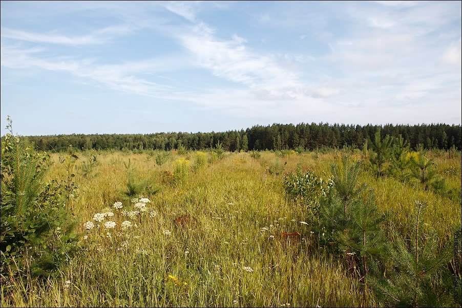 Ну что ж, небольшой экскурс в историю закончен, перейдем, пожалуй, и к самим скитам. Сначала расскажу про самый первый скит, который я посетил и найти который не составляет никакого труда. С семеновской трассы он выглядит примерно так. Поле да лес. Но если прогуляться по этому полю, то на его окраине видно современное кладбище, от которого в глубь леса ведет тропинка. По ней-то и надо идти, чтоб попасть на бывший Осинковский скит.