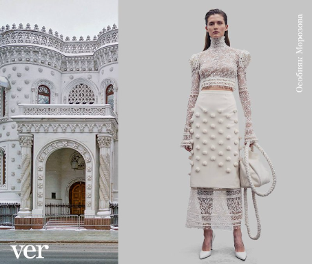 Величественные особняки Цветкова, Морозовых (Воздвиженка и Спиридоновка), Рябушинского и Коробковой обрели вторую жизнь в кутюрном обличье. Платья словно «отражение в зеркале» впитали в себя палитру и орнамент зданий. А «жемчужины» фасадов, словно по велению волшебной палочки, трансформировались в изящные детали образов: затейливые пряжки ремней, экстравагантные головные уборы, искрящиеся аксессуары и прочие «акценты», достойные кисти самого маэстро.